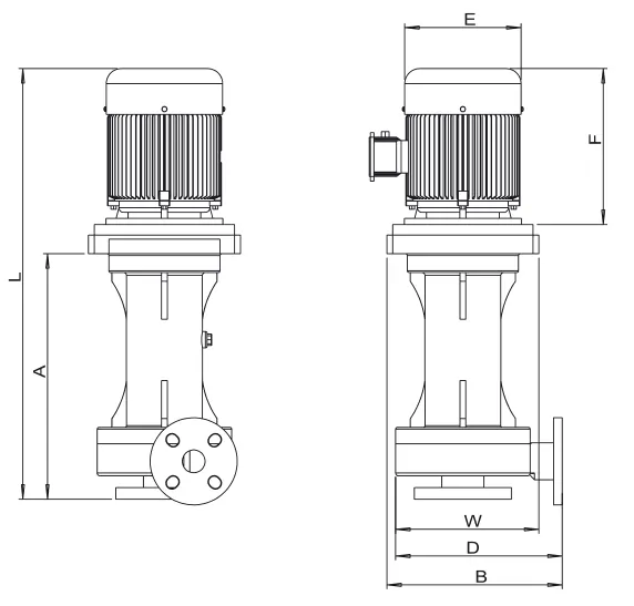 Chemical Liquid Vertical Acid Pump.Hydraulic and structural parts obtained by molding with thermoplastic materials.Sliding parts flushed by the liquid being pumped.