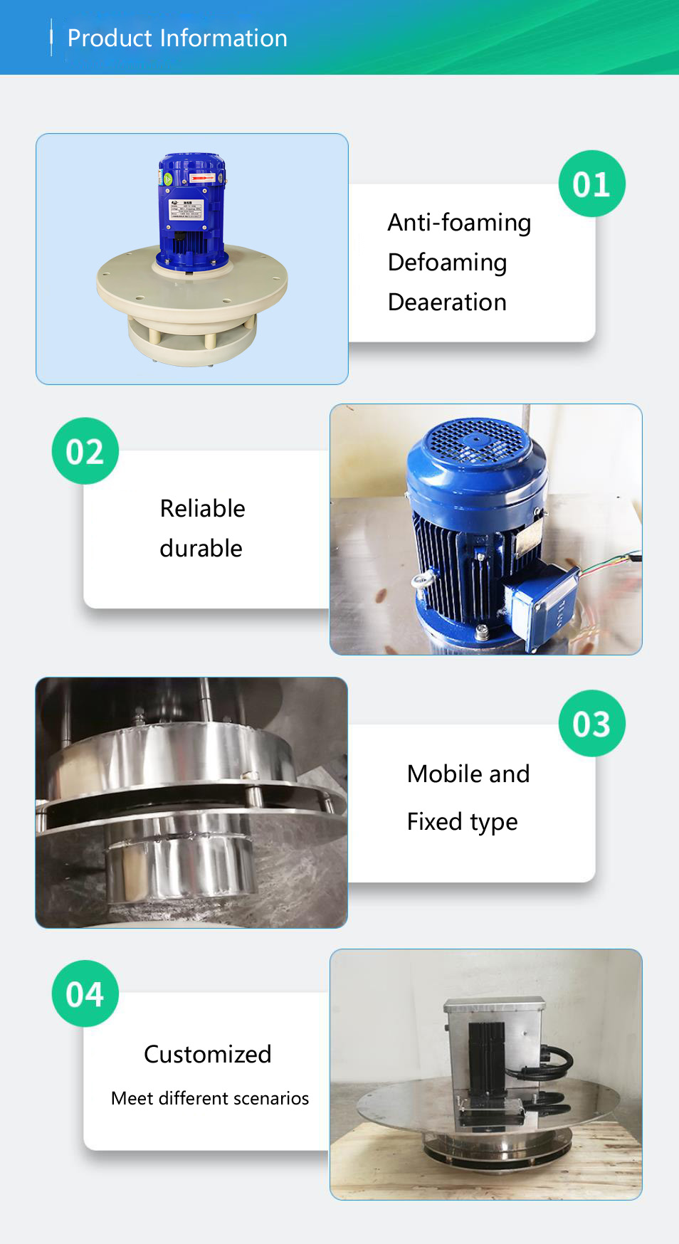 The defoamer is an open mechanical defoaming device. Its principle is as follows: Foam enters the working area of the impeller through the defoamer inlet. The shear force provided by the high-speed impeller tears the bubbles. The liquid released by the bubbles is immediately thrown towards the wall of the defoamer by centrifugal force and compressed into a liquid flow to return to the polymerization reactor, reducing liquid escape loss. The defoamer relies on the mechanical force generated by the impeller to achieve defoaming. It has a fast defoaming speed and does not require the addition of defoamers or any other substances, ensuring the purity of the product. It has become a powerful tool for anti-foaming, defoaming and defoaming. This defoamer can be started with one button, is easy to operate and convenient to maintain. It can be widely applied in fields such as sewage treatment, medicine, cleaning, paste resin, petroleum, chemical engineering, electroplating, dyeing and printing, papermaking, water-based ink, coating, fertilizer, additives, cement mortar, etc.