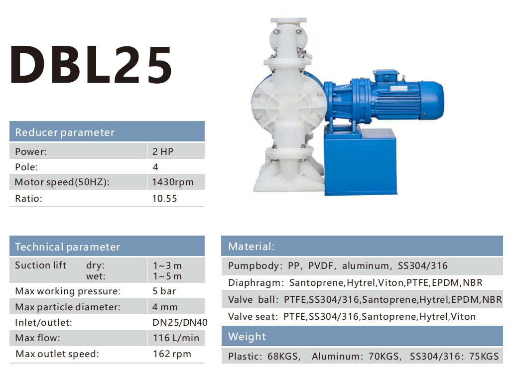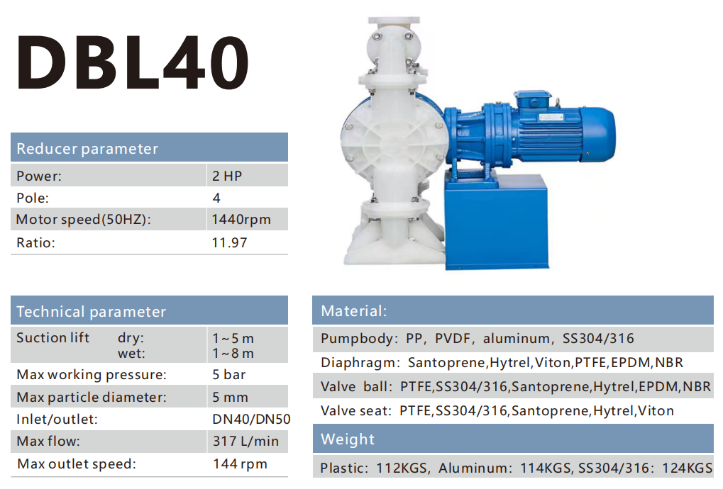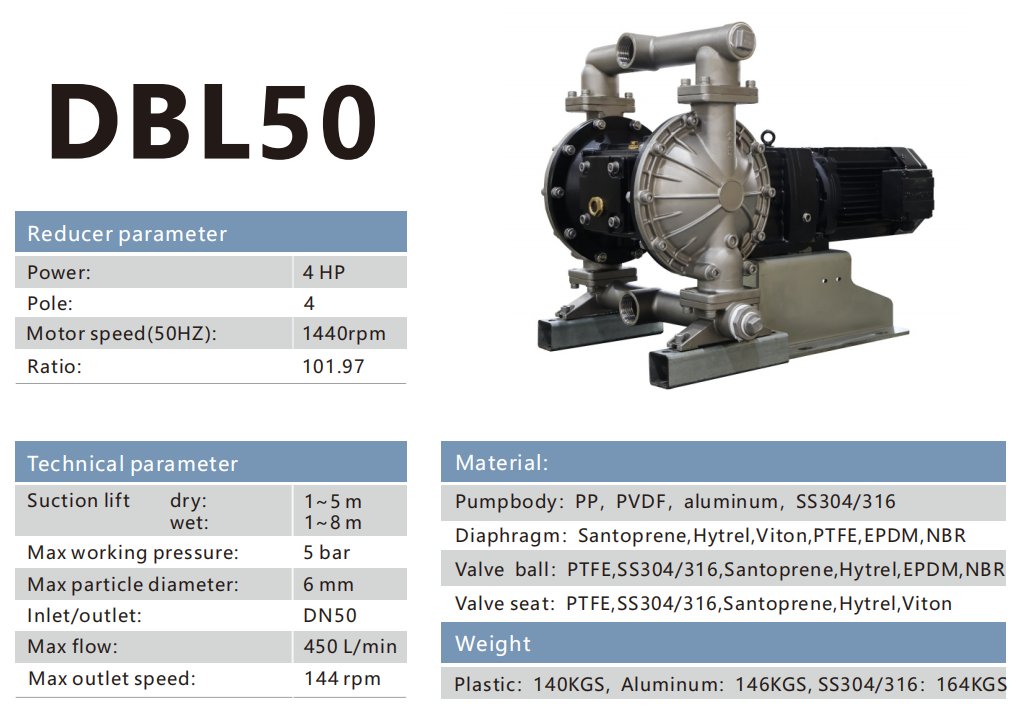 The DBL series electric diaphragm pump is a reciprocating positive displacement pump. The product consists of a motor, a drive end, and a fluid end. The deceleration motor drives the eccentric mechanism to rotate, and the eccentric mechanism drives the central shaft to perform left and right reciprocating motion, with membranes installed on both sides of the central shaft. The diaphragm moves back and forth with a certain stroke degree. When the diaphragm is pulled back, the material flows into the chamber through the inlet return valve. When the diaphragm is pushed forward, the material is discharged from the outlet return valve. The continuous reciprocating motion of the diaphragm continuously transports and discharges materials, thereby achieving the conveyance of materials.
