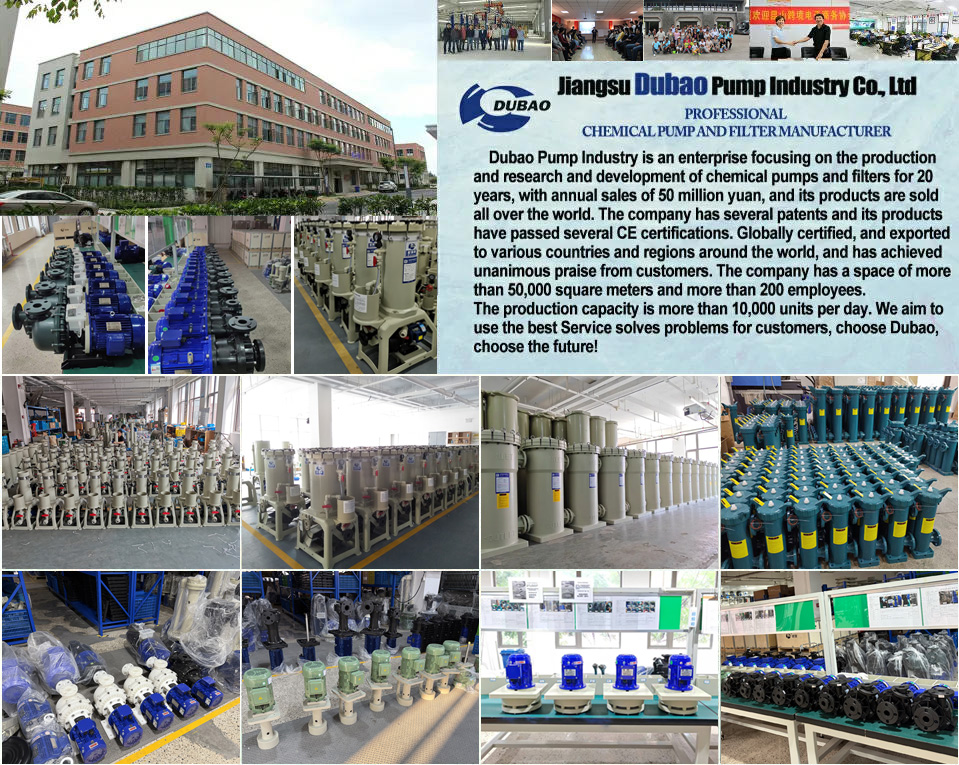 Dubao Pump Industry is an enterprise focusing on the production and research and development of chemical pumps and filters for 20 years, with annual sales of 50 million yuan, and its products are sold all over the world. The company has several patents and its products have passed several CE certifications. Globally certified, and exported to various countries and regions around the world, and has achieved unanimous praise from customers. The company has a space of more than 50,000 square meters and more than 200 employees. The production capacity is more than 10,000 units per day. We aim to use the best Service solvesproblems for customers, choose Dubao, choose the future!